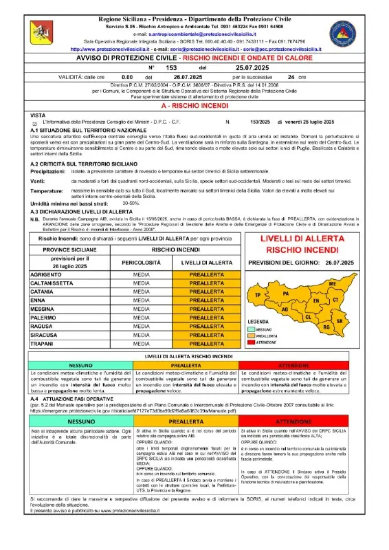 Comunicato protezione civile regionale.Avviso di protezione civile per rischio incendi e ondate di calore.Domani‚ giovedì 26 luglio 2025‚ è prevista una pericolosità MEDIA per rischio incendi in tutta la Sicilia. Bollino rosso per rischio Ondate di Calore a Messina e Catania.