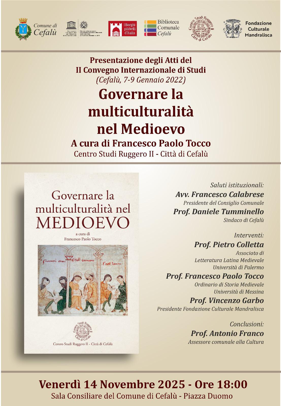 All’incontro di presentazione del volume “Governare la multiculturalità nel Medioevo”, dopo i saluti istituzionali, interverranno il prof. Tocco, il presidente della Fondazione Mandralisca Vincenzo Garbo, il professore di letteratura latina medievale dell’Università di Palermo Pietro Colletta e l’assessore alla Cultura del Comune di Cefalù, Antonio Franco.