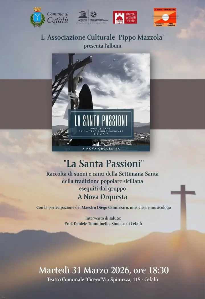 Oggi 31 marzo, Teatro Cicero, ore 18:30 "La Santa Passioni" Raccolta di suoni e canti della Settimana Santa della tradizione popolare siciliana eseguiti dal gruppo A Nova Orquesta Con la partecipazione del Maestro Diego Cannizzaro, musicista e musicologo