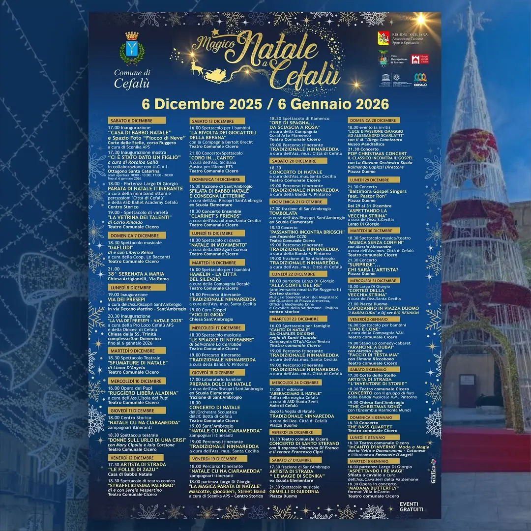 𝐌𝐚𝐠𝐢𝐜𝐨 𝐍𝐚𝐭𝐚𝐥𝐞 𝐚 𝐂𝐞𝐟𝐚𝐥𝐮̀ 𝟐𝟎𝟐𝟓 ✨ Dal 6 dicembre al 6 gennaio 2026, la città si accende di luci, musica, tradizioni e appuntamenti per grandi e piccoli. Un mese intero per vivere la magia del Natale tra spettacoli, mercatini, eventi culturali e l’atmosfera unica del nostro borgo. 🎄💫 Scopri il program