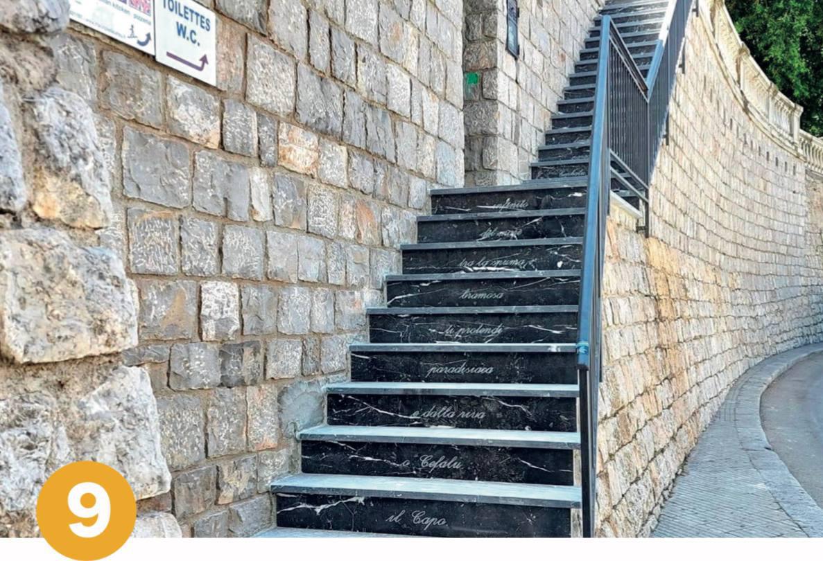 Lighting, staircase of Via Cavour: LED lights recessed in gray marble illuminate the elegy of Ludwig I of Bavaria in Italian, German and English (caption of the painting Cefalù, K. Rottmann, 1830, Wallraf-Richartz Museum, Cologne): "You are called the Head, or Cefalù, and from the paradisiacal shore you stretch out to the infinite sea foam".